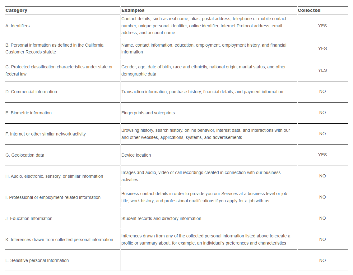 The table below shows the categories of personal information we have collected in the past twelve (12) months. The table includes illustrative examples of each category and does not reflect the personal information we collect from you.